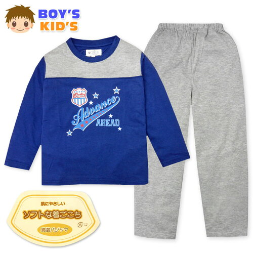 【送料無料】男児 キッズ 天竺 長袖 パジャマ 上下組 薄手 綿混 肌にやさしいソフトな着ごこち ヨーク切替 ロゴプリント 子供服 男の子 120cm a-2148c-nv【メール便対応】